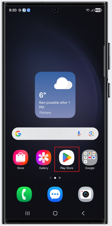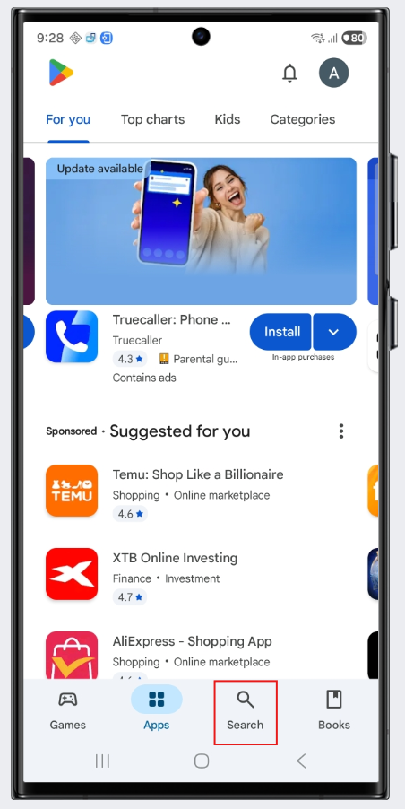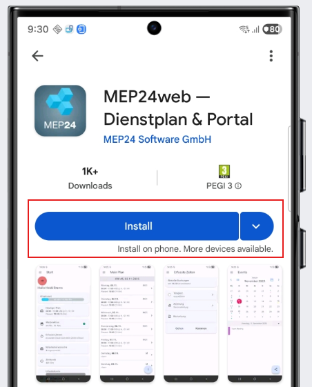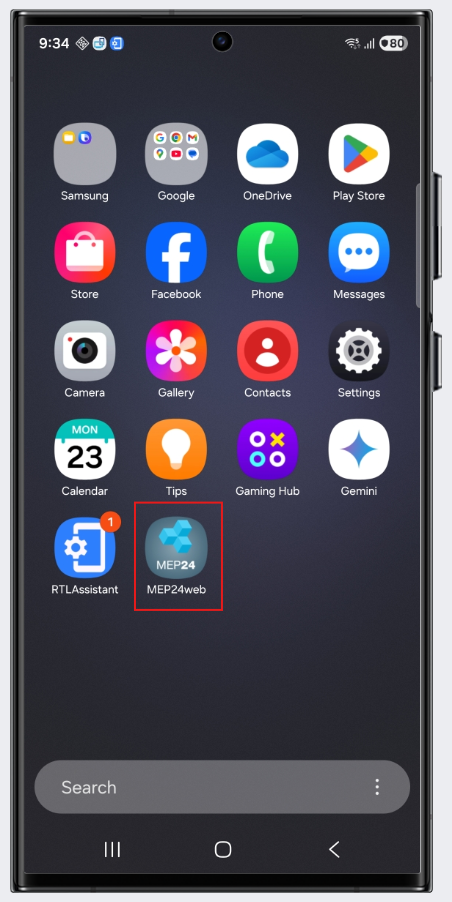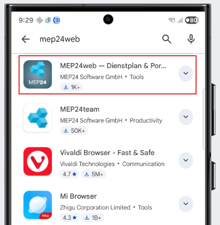 12.) Nun sind wir erfolgreich im Play Store angemeldet und können die MEP24web-App herunterladen, in dem wir unten auf "Search" klicken und nach der gewünschten App suchen