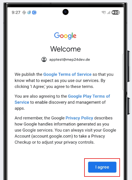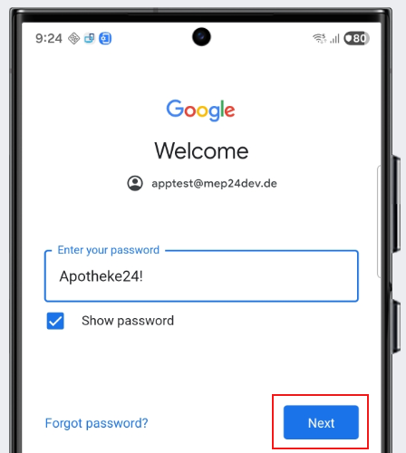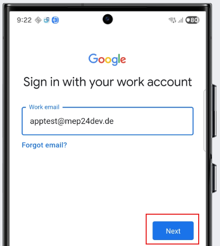 9.) E-Mail-Adresse apptest@mep24dev.de eingeben und auf "Next" klicken