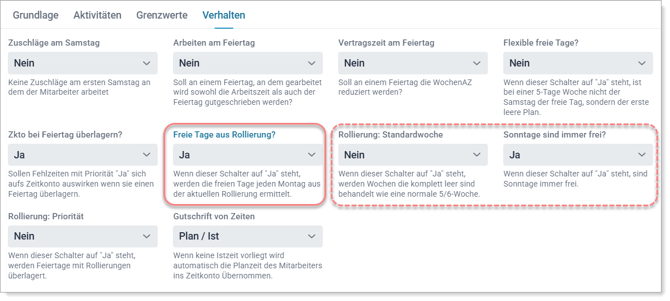 • Rollierung: Standardwoche: Ist dieser Schalter auf „Ja“, werden komplett leere Woche wie 5-/6-Tage-Woche behandelt. Wenn nur die geplanten Tage für die Bewertung der Fehlzeit herangezogen werden sollen, muss „Nein“ gewählt sein.