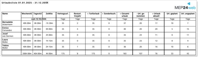 Liste mit aktuellem Urlaubs - und Kontostand (Bericht: Urlaubsliste)