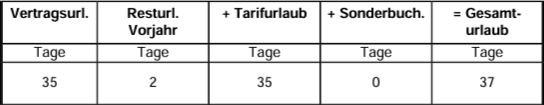| = Gesamturlaub: | Hier wird die Summe von „Resturl. Vorjahr“, „+Tarifurlaub“ und „+Sonderbuch.“ angezeigt. |