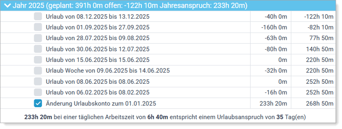 Direkt darunter werden Ihnen der Jahresanspruch in Stunden, Stundenwert/Tag sowie der Urlaubsanspruch in Tagen angezeigt.