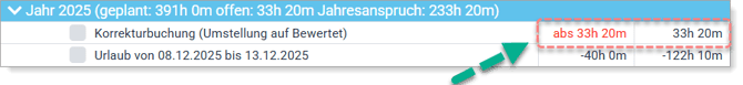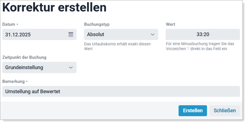 - Damit das Urlaubskonto zum 01.01. eines Jahres korrekt startet, muss eine absolute Korrektur auf den 31.12. des Vorjahres im Urlaubskonto durchgeführt werden.