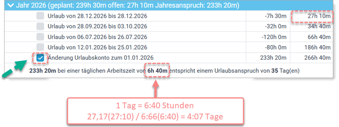 ⚠️ Die Umstellung wirkt sich rückwirkend auf das Urlaubskonto aus.