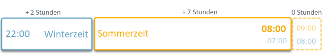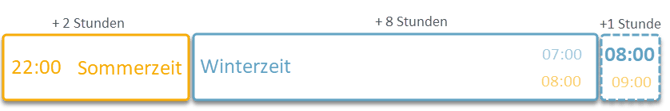 - Ein Mitarbeiter wird von 22:00 (Winterzeit) bis 08:00 (Sommerzeit) geplant. Durch die Zeitumstellung von Winter- auf Sommer verkürzt sich seine Arbeitszeit um 1 Stunde.
