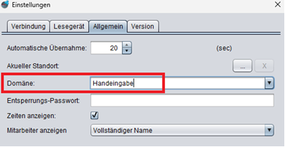 ZiB starten -> rechts oben auf Einstellungen klicken -> 3. Reiter Allgemein -> Domäne: Beim ersten Einrichten, tragen Sie die Art der Eingabe (z.B. „Handeingabe“) in das Feld ein.