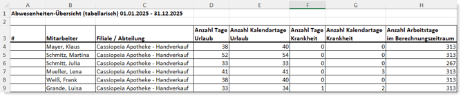Abwesenheitsübersicht (tabellarisch): im Excel (XLSX-Format)