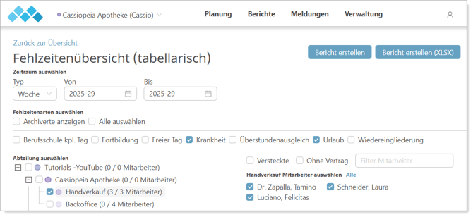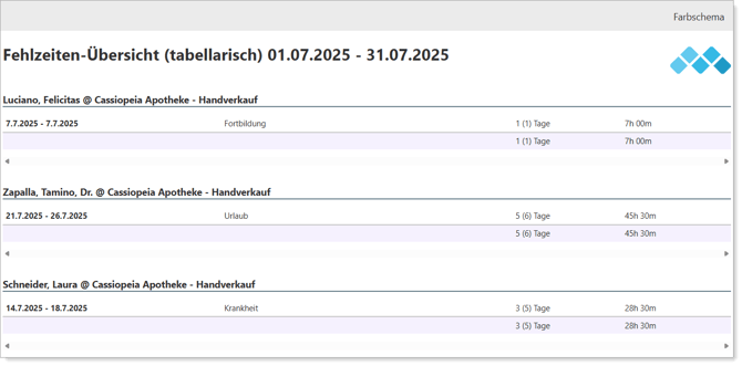 Bericht: Fehlzeitenübersicht (tabellarisch)
