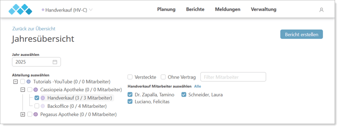 Versteckte | Versteckte Mitarbeiter werden mit angezeigt. Es handelt sich hierbei um Mitarbeiter, die über Verwaltung -> Mitarbeiter -> Benutzer verstecken (Augen-Symbol) versteckt wurden. |