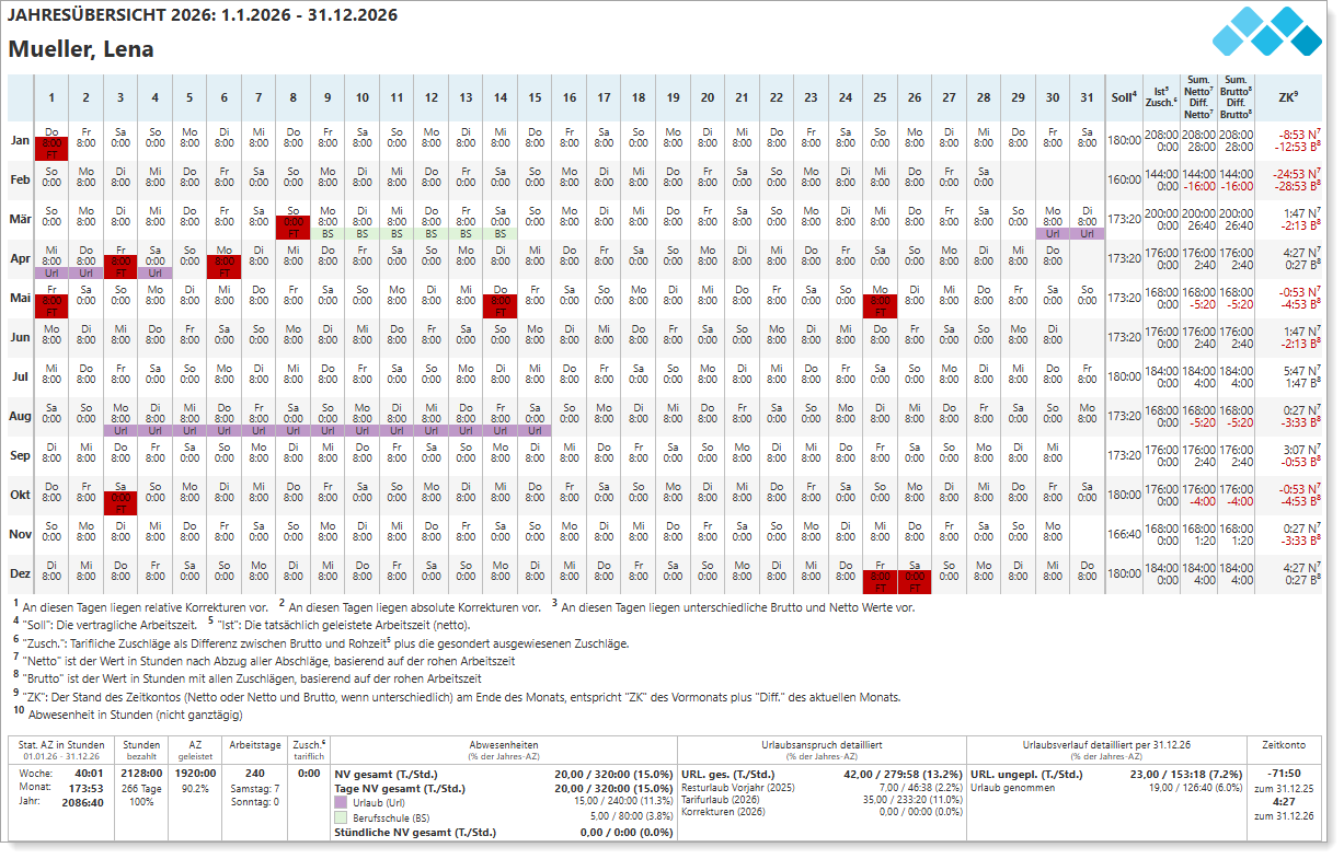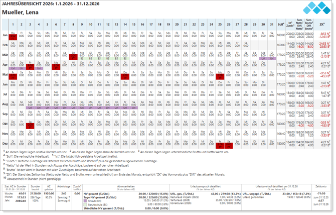 und Abwesenheiten pro Mitarbeiter inklusive der bereits genommenen, sowie verbleibenden Urlaube zum ausgewählten Jahr und dem Verlauf des Zeitkonto. Zusätzlich erhalten Sie statistische Werte zur Jahres-, Monats- und Wochen-Arbeitszeit, sowie zu den Abwesenheiten.