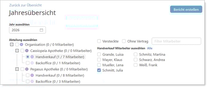 | Filter Mitarbeiter | Die Filterfunktion erleichtert die Suche nach einem Mitarbeiter, die für den Bericht berücksichtigt werden sollen. |
