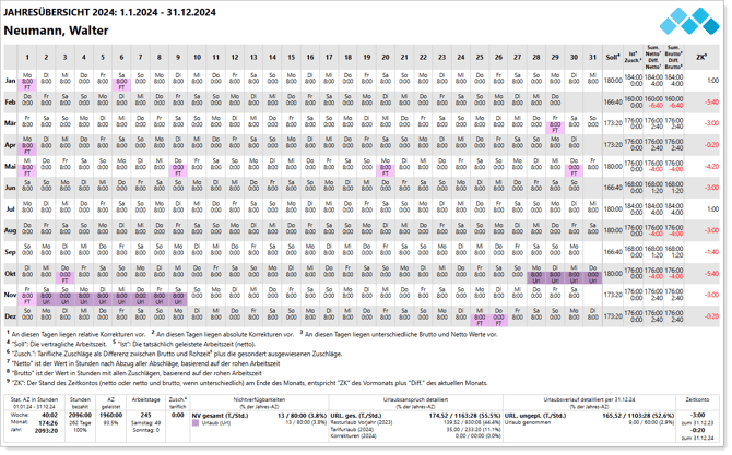 und Nichtverfügbarkeiten pro Mitarbeiter inklusive der bereits genommenen, sowie verbleibenden Urlaube zum ausgewählten Jahr und dem Verlauf des Zeitkontos. Zusätzlich erhalten Sie statistische Werte zur Jahres-, Monats- und Wochen-Arbeitszeit, sowie zu den Abwesenheiten.