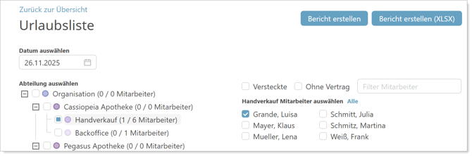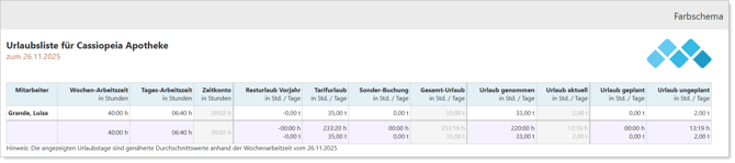 Wenn Sie die Urlaubs- und Zeitkontenstände zu einem gewissen Stichtag auswerten möchten, können Sie den Bericht „Urlaubsliste“ verwenden.