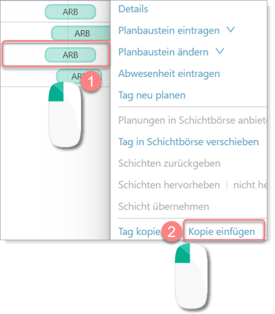4. Klicken Sie den Tag mit Linksklick an, ab dem Zeitpunkt an dem die Planbausteine eingefügt werden sollen. Im sich öffnenden Fenster auf Kopie einfügen klicken.