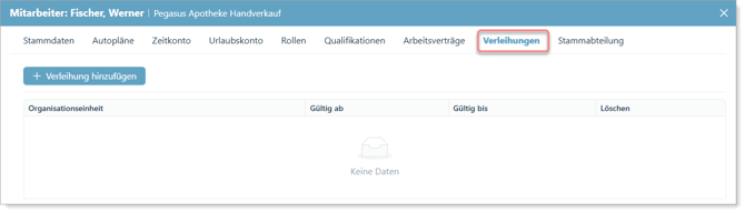 Sie können Mitarbeiter für einen bestimmten Zeitraum in eine andere Organisationseinheit ausleihen. Dadurch erhält ein planungsverantwortlicher Benutzer, der nur die Rechte für eine bestimmte Organisationseinheit verfügt die Möglichkeit, diesen Mitarbeiter für diesen Zeitraum zu planen.