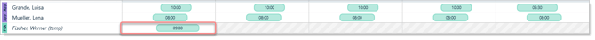 Im Planer wird der Mitarbeiter für den festgelegten Zeitraum im Verleihungsziel dargestellt. Der Name des Mitarbeiters wird Kursiv dargestellt und endet mit (temp) - für Temporär.