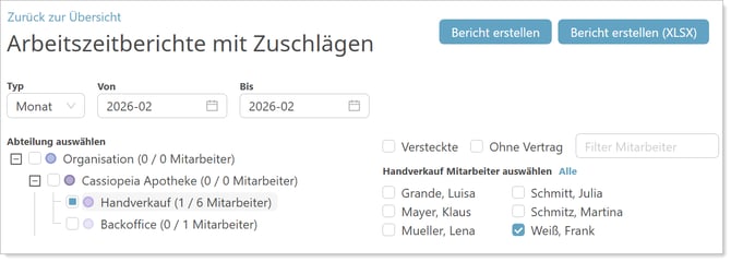 | Filter Mitarbeiter | Die Filterfunktion erleichtert die Suche nach einem Mitarbeiter, der für den Bericht berücksichtigt werden soll. |