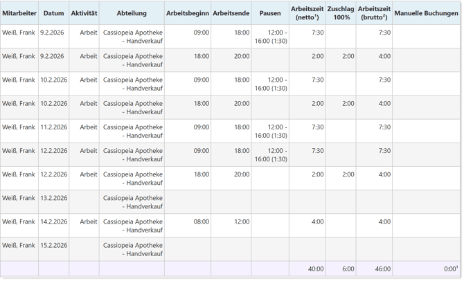 | Arbeitszeit (Brutto) | Zeigt die Arbeitszeit inkl. Zuschlag an. |