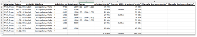 | Arbeitszeit (Netto) | Zeigt die Arbeitszeit exkl. Zuschlag an. |