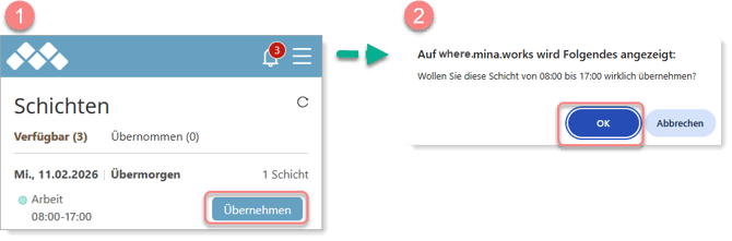 - Mobilanwendung -> Reiter: Schichten -> Übernehmen -> OK