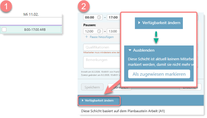 Über Verfügbarkeit ändern -> Als zugewiesen markieren gilt die Schicht als "zugewiesen" und steht für die weitere Verwendung nicht zur Verfügung.