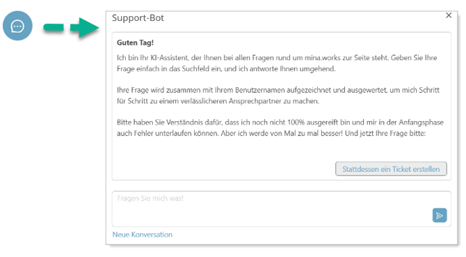 Klicken Sie unten Links auf das "blaue" Support-Symbol, um das Support-Fenster zu öffnen. Sie können direkt mit der Konversation "über den Support-Bot" beginnen.