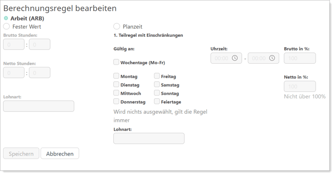 | Fester Wert | Für Tätigkeiten mit dieser Berechnungsregel werden dem Zeitkonto, unabhängig von der geplanten Dauer, ein fester Wert gutgeschrieben. |