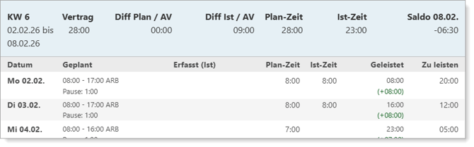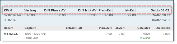 | Vertrag | Zeigt die zu leistende wöchentliche Vertragszeit an. | ||||