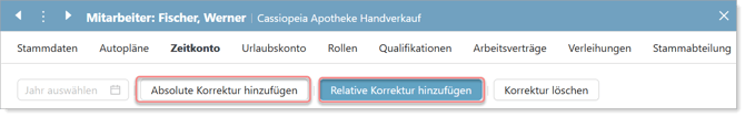 mina: Verwaltung -> Mitarbeiter -> Zeitkonto -> Relative Korrektur hinzufügen / Absolute Korrektur hinzufügen