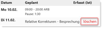 2. Die gewünschte Kalenderwoche im Zeitkonto aufklappen und auf löschen klicken.