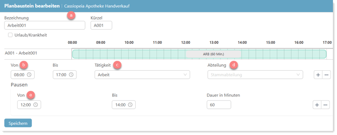 Legen Sie zu Beginn alle Arbeitszeiten, die bei Ihnen im Unternehmen vorkommen, als Planbausteine an. Dies ermöglicht Ihnen, Arbeitszeiten die mehrfach vorkommen schnell und unkompliziert jedem Mitarbeiter zuzuordnen.
