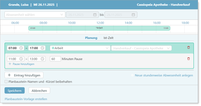 - Bei Bedarf auf + Pause hinzufügen klicken, um Pausen einzutragen. Von, Bis und die Dauer (Minuten Pause) eintragen.