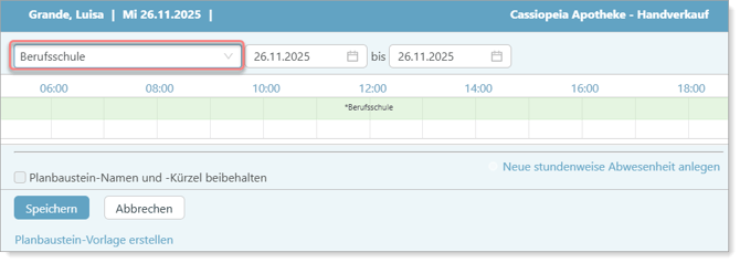 Abwesenheit wählen: (Hinterlegt eine sich wiederholende Abwesenheit, wie Berufsschule)