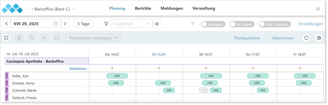 Öffnungszeiten | Für den Zeitraum werden unter Organigramm -> Stammdaten hinterlegte Öffnungszeiten herangezogen. | |