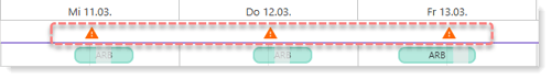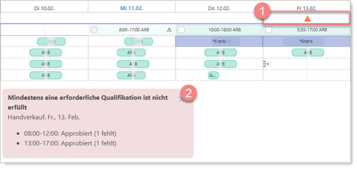 Sobald innerhalb der Öffnungszeiten ein Mitarbeiter mit einer Qualifikation, für die Sie einen Anwesenheits-Check hinterlegt haben, fehlt, werden Sie in der Planung mit einem orangenen Dreieck gewarnt.