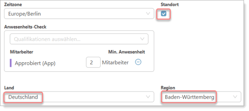 - Fügen Sie die gewünschte Qualifikation unter Anwesenheits-Check ein ( bei Bedarf wählen Sie weitere Qualifikationen aus, es wird zunächst lediglich ein Mitarbeiter pro Qualifikation erwartet, über Min. Anwesenheit wählen Sie die gewünschte Anzahl).