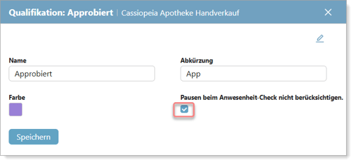 Hinweis: Soll die Pause des Mitarbeiters vom Anwesenheits-Check ignoriert werden gehen Sie auf Verwaltung -> Qualifikationen -> Qualifikation auswählen -> Bearbeiten. Setzen einen Haken bei Pausen beim Anwesenheit-Check nicht berücksichtigen -> und bestätigen dieses mit Speichern.
