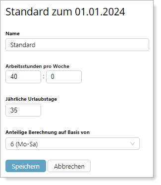 Wählen Sie bei Bedarf eine neue Berechnungsgrundlage für Feiertage, Tätigkeiten sowie Nichtverfügbarkeiten aus, diese dient der Berechnung im Zeit- und Urlaubskonto. Wählen Sie hier nichts aus, gelten die Berechnungseinstellungen aus den Standard Berechnungsregeln. Wurde dort nichts hinterlegt gilt bei Nichtverfügbarkeiten der Default von dem Durchschnitt auf Basis der Werktage 6 und bei Tätigkeiten die Planzeit.