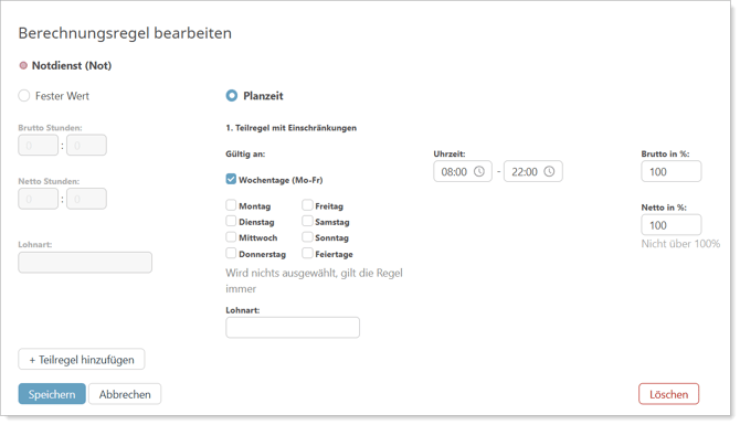 Planzeit | Für Tätigkeiten mit dieser Berechnungsregel werden exakt die Stunden dem Zeitkonto gutgeschrieben, die in der Planung eingetragen sind. Plus evtl. definierter Teilregeln (Zu- bzw. Abschläge). |