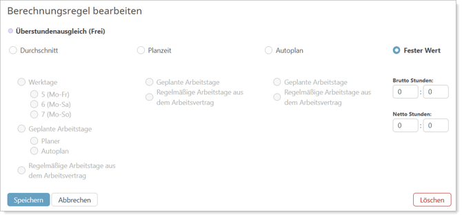 Fester Wert | Für Tätigkeiten mit dieser Berechnungsregel wird dem Zeitkonto, unabhängig von der Dauer, ein fester Wert gutgeschrieben. |